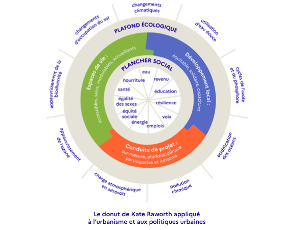 Grâce à Amsterdam, l’économiste Kate Raworth est passée de la théorie à la pratique en dressant le portrait de la ville avec ses enjeux locaux, tels que le logement pour lequel la demande sociale est forte et les enjeux climatiques essentiels. Son équipe travaille aussi pour les villes américaines de Philadelphie et Portland en animant des ateliers réunissant des décideurs et des acteurs du changement dans des discussions dynamiques et stimulantes. Des portraits de ville sont réalisés, portraits publics dessinés à l’aide de cibles et de données accessibles à tous. À travers la mobilisation sociale, « ils deviennent autoportrait, rassemblant les expériences vécues des habitants, leurs valeurs, leurs espoirs et leurs craintes, leurs idées et leurs initiatives, leur propre compréhension de leurs interconnexions profondes avec le reste du monde », explique Kate Raworth. Pour Marieke van Doorninck, maire-adjointe en charge de la durabilité et de l’aménagement à Amsterdam, « Le donut ne nous fournit pas les réponses, mais une manière de regarder la réalité, de façon à éviter d’utiliser les mêmes structures auxquelles nous sommes habitués ». Cela permet surtout aux habitants, aux acteurs publics et privés, de s’accorder sur les limites à l’intérieur desquelles agir et de comprendre comment atteindre leurs objectifs. Avec une connaissance plus fine du territoire et des enjeux partagés.