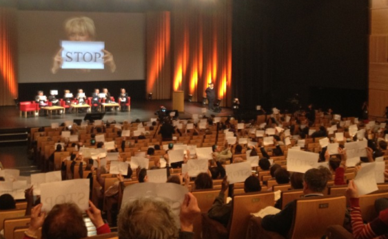 Illustration : À l’initiative de Geneviève Garrigos, présidente d’Amnesty International-section française, les participants du Vème Forum mondial des droits de l’homme ont marqué deux minutes de silence et brandit le message « STOP » contre les exactions de l’armée syrienne.